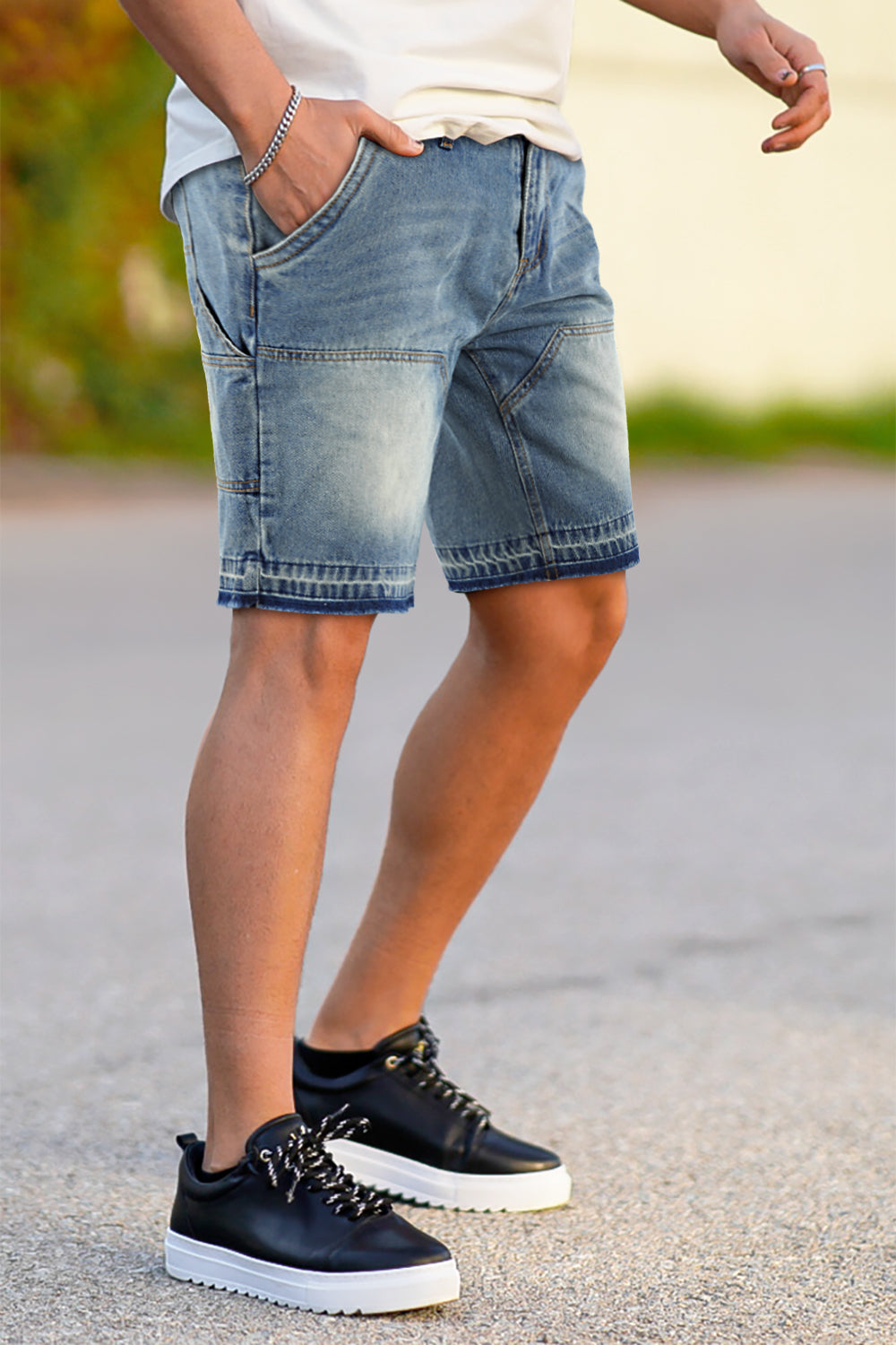 Los shorts de mezclilla elastizados para hombre son una herramienta de moda indispensable para los hombres urbanos. El diseño clásico crea un estilo moderno y elegante.