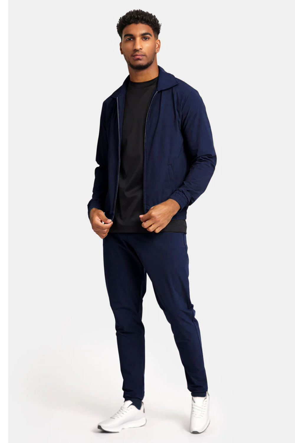 Présentation de notre survêtement bleu marine pour hommes, conçu avec une coupe ajustée et confectionné dans un tissu ultra confortable. Cet ensemble polyvalent est parfait pour les sorties décontractées et constitue également la tenue idéale pour vos entraînements et vos routines de fitness. Restez élégant et confortable, que vous soyez en déplacement ou que vous transpiriez.