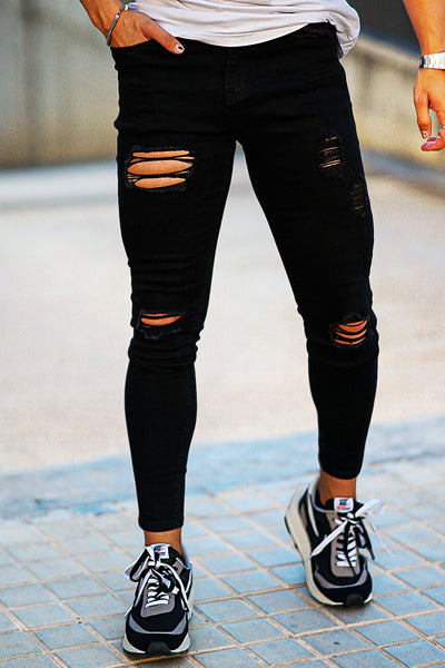 Heren gescheurde knie-jeans zwarte stretch-jeans
