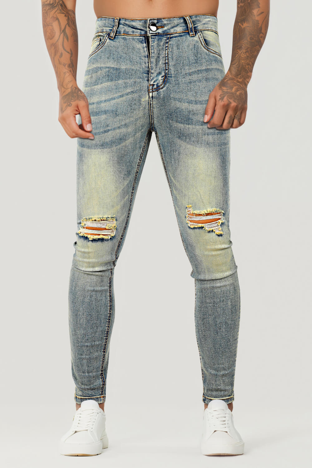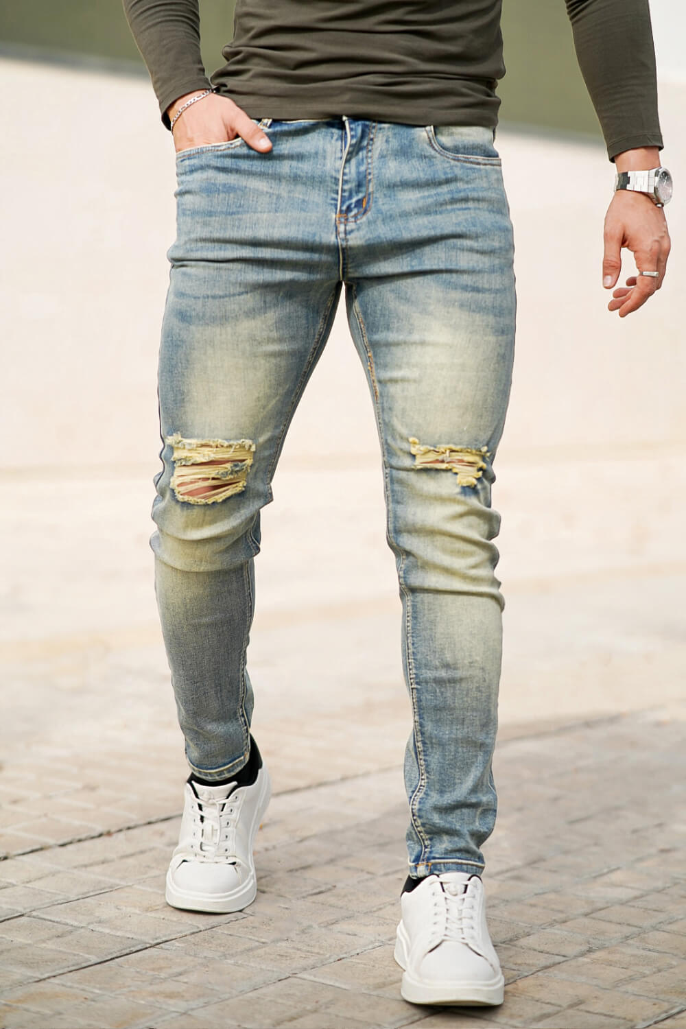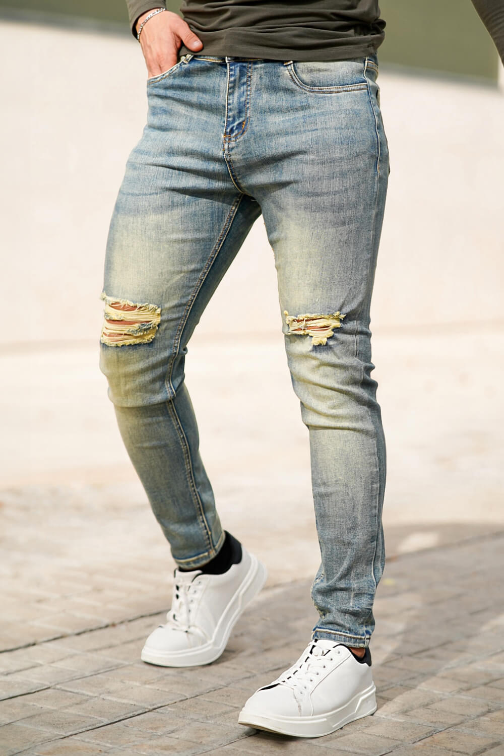 Super comfortable and high-stretch denim jeans designed with a form-flattering, muscular thighs fit. our blue skinny jeans ripped fit your lower body to wear all day long and can be paired with our popular basic tops.