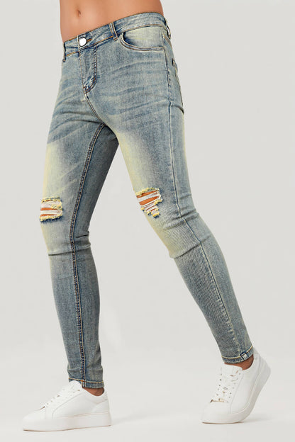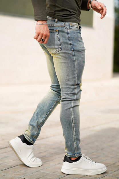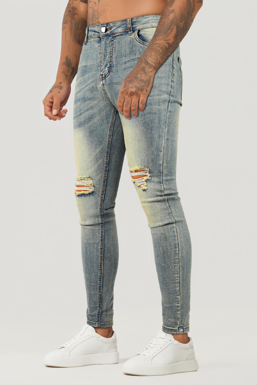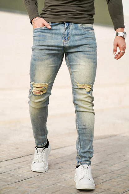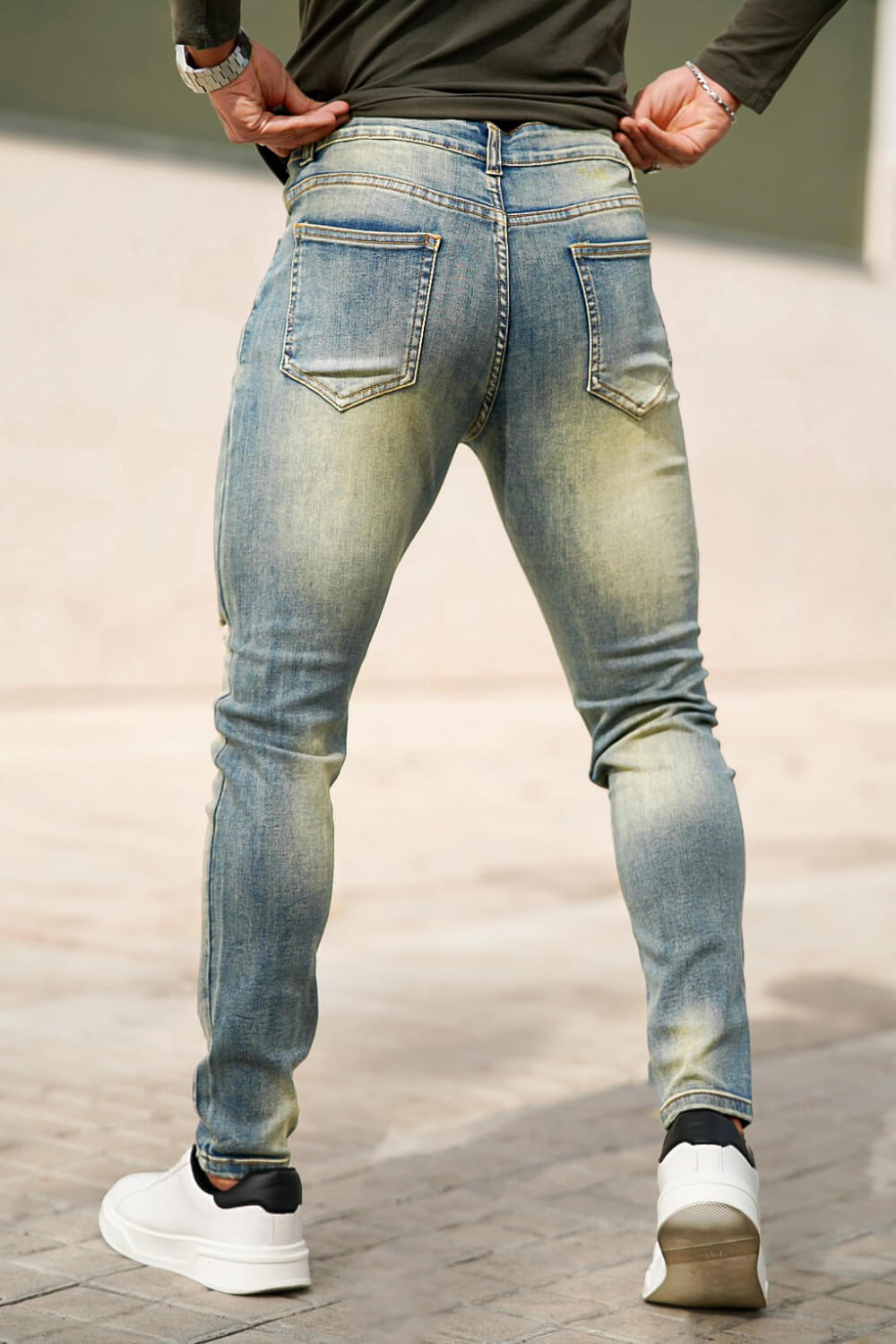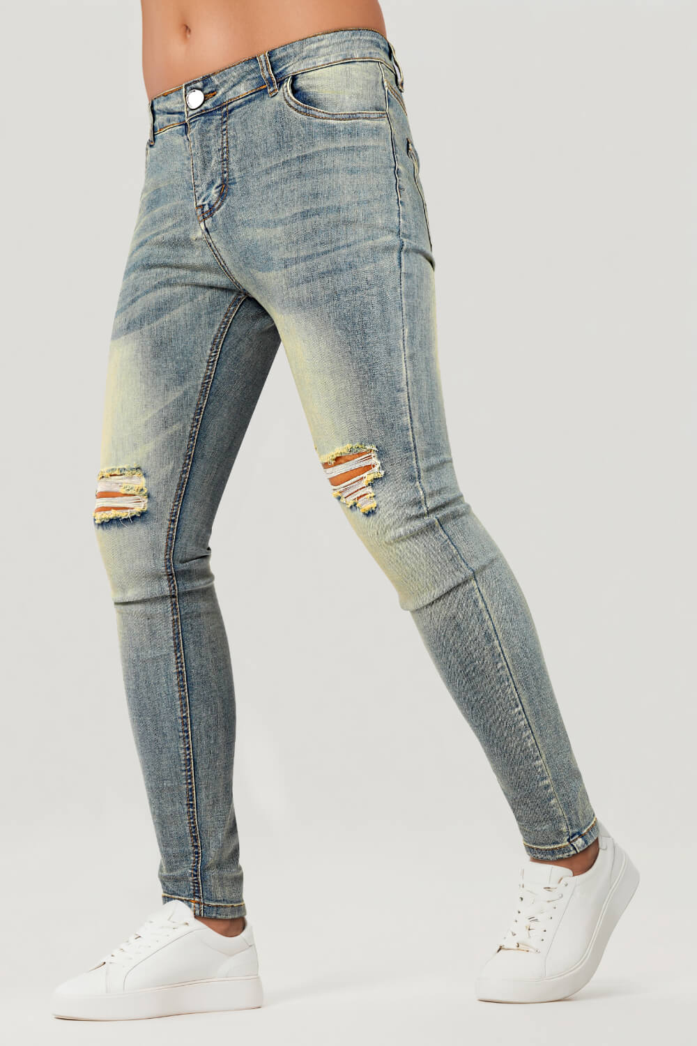 Super comfortable and high-stretch denim jeans designed with a form-flattering, muscular thighs fit. our blue skinny jeans ripped fit your lower body to wear all day long and can be paired with our popular basic tops.